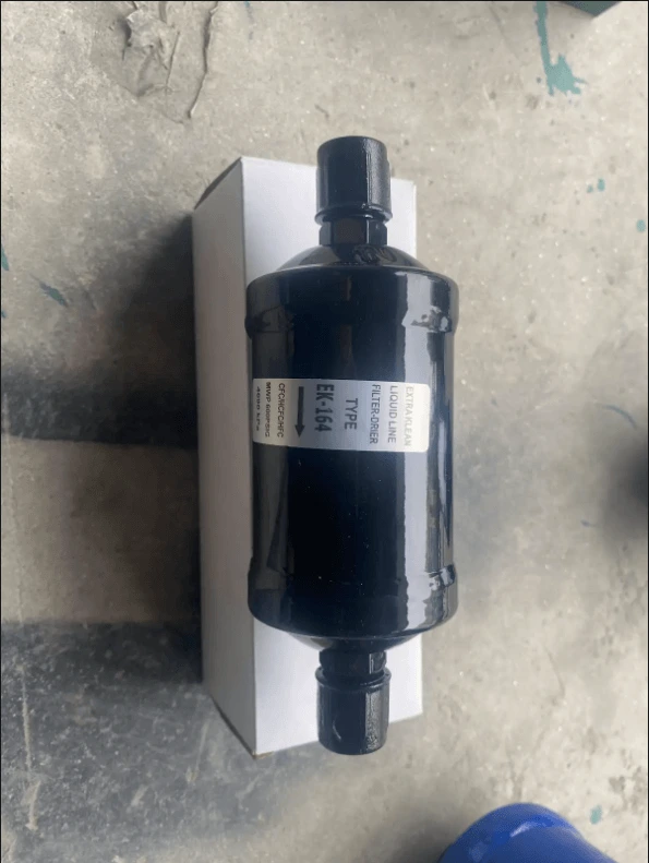 - Cấu tạo: Phin lọc EK-164 có cấu tạo dạng ống trụ kín, thường được làm từ thép chịu áp lực. Bên trong có chứa các hạt hút ẩm đặc biệt (thường là rây phân tử Zeolit) và một lưới lọc tinh với kích thước nhỏ (khoảng 20 micron) để giữ lại các cặn bẩn cơ học như mạt kim loại, gỉ sét…
